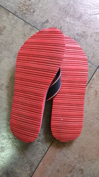 Chanclas de la marca Tommy Hilfiger con un diseño llamativo. - Tira en color rojo, blanco y azul marino. - Suela negra con detalles en rojo. - Logo de Tommy Hilfiger en la tira y en la suela.