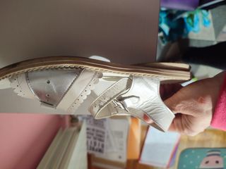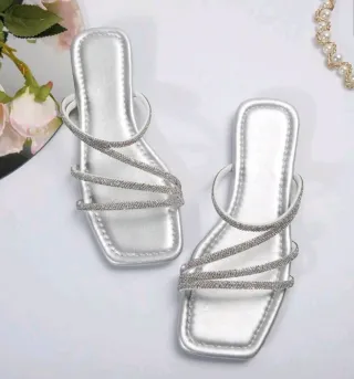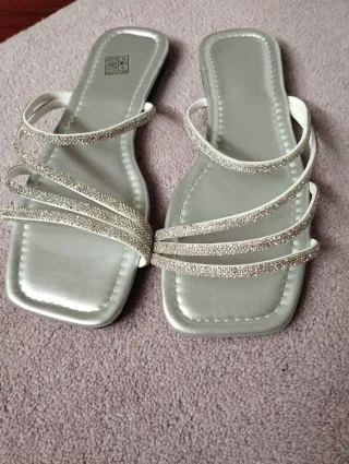 Sandalias planas plateadas con un diseño elegante y detalles brillantes. - Tiras adornadas con pedrería. - Diseño de punta cuadrada. - Suela plana para mayor comodidad. Están nuevas sin estrenar, se venden porque me quedan grandes son un 39 (yo uso un 38)