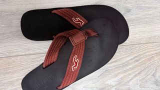 Chancletas de la marca Hollister. - Tira de tela marrón con logo. - Suela negra.