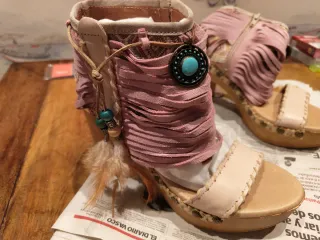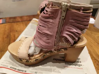 Sandalias de estilo boho con detalles únicos. - Diseño con flecos en color rosa. - Adornos de abalorios y plumas. - Cierre de cremallera lateral. - Plataforma y tacón.