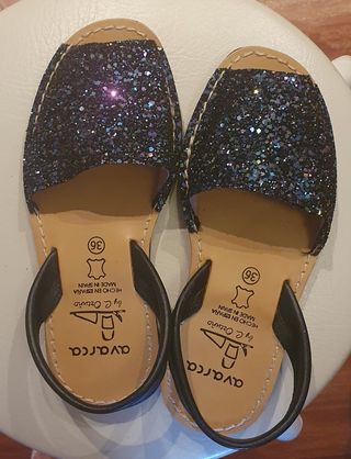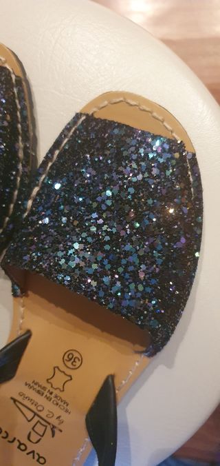 Preciosas menorquinas de la marca Avarca, ideales para el verano. ✨ Son de color negro con purpurina, ¡perfectas para cualquier ocasión! - Fabricadas en España. - Talla 36. - Material: piel. - Diseño elegante y cómodo.