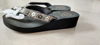 Preciosas chanclas de la marca Corina. Son de color negro y tienen un diseño elegante y sofisticado. - Están adornadas con flecos negros y brillantes pedrería. - Ideales para el verano. - Se venden dos pares.