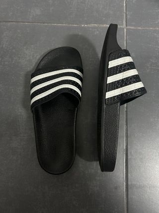 Vendo un par de chanclas Adidas nuevas, con rayas azul marino y blanco. Son muy bonitas y parecen estar en perfecto estado. - Diseño de rayas marineras. - Logo Adidas en relieve. - Material de goma resistente.