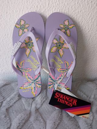 Chanclas originales de la serie Stranger Things, en color lila con diseño exclusivo inspirado en la famosa serie de Netflix. ✔️ Producto con licencia oficial. ✔️ Talla EU 38/39 (UK 5/5,5). ✔️ Totalmente nuevas, con etiqueta. ✔️ Ideales para fans y coleccionistas, o para lucir un look veraniego único. 💜 Diseño cómodo, ligero y resistente. Soy de Canarias y wallapop no hace envíos Canarias a Península. Si te interesa te las puedo enviar x Correos certificado con seguimiento del envío fuera de la plataforma. #StrangerThings #Netflix #Chanclas #Sandalias #Verano #FlipFlops #RopaGeek #MerchOficial #Coleccionista #ModaUrbana