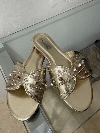 Elegantes sandalias doradas de la marca Tulipano. Un toque de brillo para tus pies. - Diseño con tiras cruzadas. - Adornadas con pedrería y tachuelas. - Suela plana para mayor comodidad.