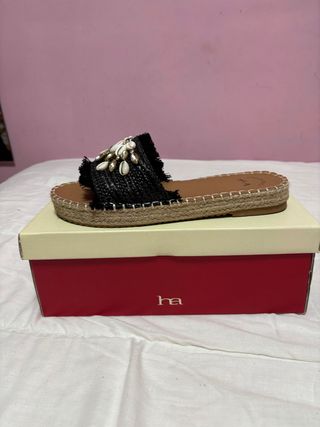 Sandalias negras de estilo veraniego, perfectas para lucir en los días soleados. Su diseño con detalles de conchas le da un toque único. - Material de rafia. - Adorno de conchas y abalorios. - Suela con acabado de esparto.