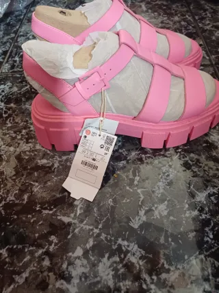 Sandalias de la marca Zara en color beige y talla 39. Diseño moderno y cómodo. - Tiras ajustables con velcro. - Suela de plataforma ligera. - Detalle de tiras cruzadas en la pala.
