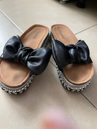 Sandalias de la marca Lamoda con un diseño moderno y llamativo. - Tira delantera con detalle de lazo. - Suela gruesa con adornos plateados. - Diseño bicolor en negro y plateado.
