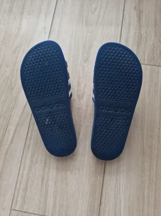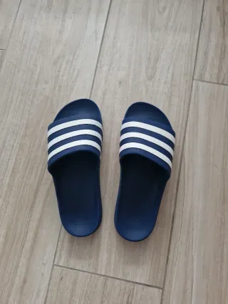 Chanclas de la marca Adidas en color azul marino con detalles blancos. - Diseño clásico de tres rayas. - Tira ancha con el logo.