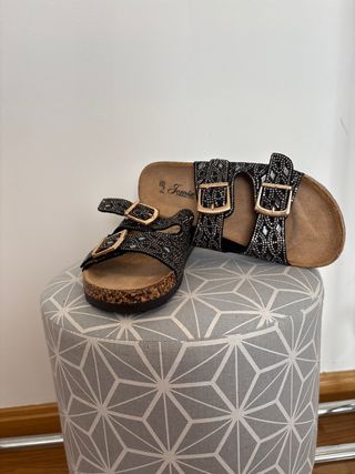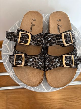 Sandalias de la marca Jomix con un diseño adornado con brillantes. - Tira doble con hebillas. - Detalle de pedrería y tachuelas. - Suela de corcho.