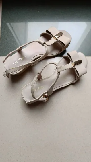 Elegantes sandalias de la marca ANTEA en color beige con detalles dorados. - Diseño con lazo decorativo en la pala. - Tira fina al tobillo con cierre de hebilla. - Suela plana para mayor comodidad.