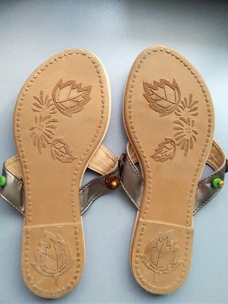 Vendo estas chanclas o sandalias de mujer del número 36 (24cm). Son de color marrón con adorno en la parte superior y con un plástico protector en el la separación para el dedo. Se encuentran en buenas condiciones (tienen un pequeño golpe en la parte delantera de la chancla izquierda, se ve en la cuarta fotografía) ya que sólo se han usado una vez. Recogida en Villaverde bajo, cualquier duda preguntar por chat.