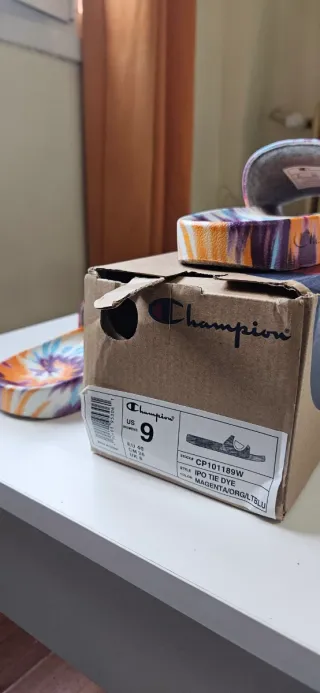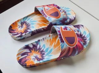 Chanclas de la marca Champion con un llamativo diseño tie dye. - Estampado multicolor vibrante psicodélico - Logo de Champion en la tira. Las vendo sin usar porque las compré en talla 40EU pero dan muy poca talla y no me valen, así que realmente son una 39EU 70s 90s Y2k playa