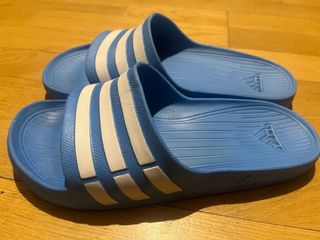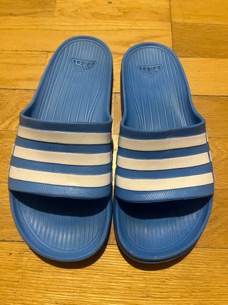 Chanclas Adidas en color azul, talla 8 (equivalente a 41-42 en España). Están en perfecto estado. Se entregan lavadas.