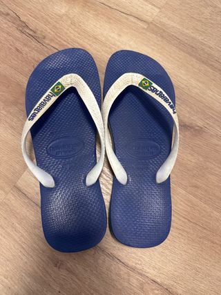 Chanclas de la marca Havaianas en talla 41-42. - Diseño con tiras blancas. - Suela azul con textura. - Detalle de la bandera de Brasil en las tiras.