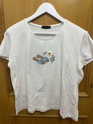 Camiseta blanca con un bonito bordado. - Diseño de chanclas y flor. - Cuello redondo. - Manga corta.
