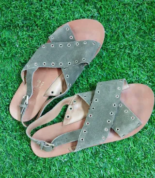 Sandalias planas de ante en color verde oliva. Tienen un diseño cruzado con múltiples ojales metálicos y una tira ajustable en el tobillo. - Material: Ante - Diseño cruzado - Ojales metálicos - Tira ajustable