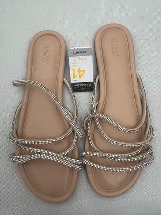 Preciosas sandalias planas con brillantes. ✨ Ideales para verano. - Diseño de tiras múltiples. - Material cómodo y ligero. - Dos pares disponibles (beige y dorado).