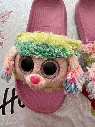 Adorables chanclas con diseño de perro de peluche. Son un número 37/38. - Suaves y divertidas. - Tira multicolor. - Base rosa.