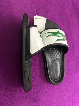 Chanclas de la marca Lacoste con un diseño llamativo. - Banda superior blanca con el icónico cocodrilo verde. - Suela negra con textura. - Incluye etiquetas.