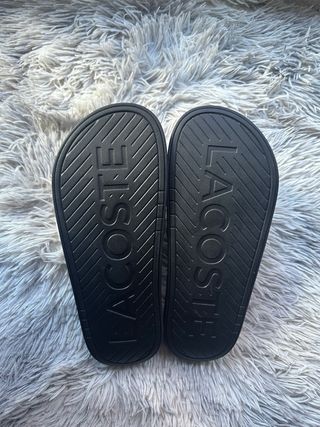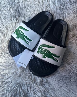 Chanclas de la marca Lacoste con el icónico cocodrilo. - Banda superior blanca con cocodrilo verde. - Suela negra con relieve. - Detalle del logo en la plantilla.