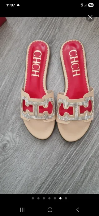 Elegantes sandalias con un diseño llamativo. - Detalle de pedrería en la tira. - Interior en color rojo vibrante. - Suela cómoda para el día a día.