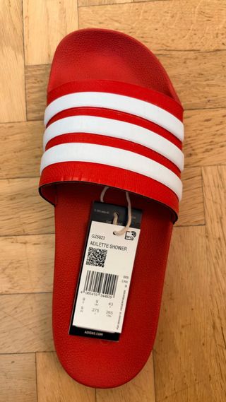 Chanclas Adidas Adilette Shower, color rojo con rajas y logo blanco, número 43. Nuevas, en su caja original y con la factura, compradas en Adidas online por 28€. Cómodas y con la tecnología Cloudfoam para una amortiguación óptima. Suela está hecha de caucho y material exterior sintético, con lo cual, ideales para la ducha, ya que eso proporciona secado rápido. Número de serie: GZ5923