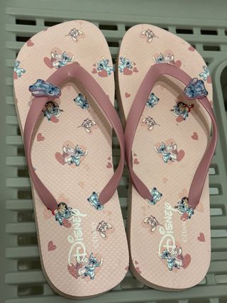 Adorables chanclas con el personaje Stitch de Disney. - Diseño en color rosa con estampado de Stitch y corazones. - Tira de sujeción en color rosa. - Detalle de aplique de Stitch en la tira.