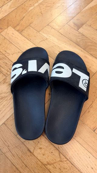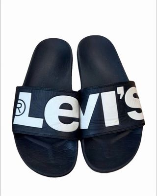 Chanclas Levi’s June regular black, talla 42 en muy buen estado, el desgaste se ve únicamente en la suela. Color negro con logo escrito en blanco. Diseño moderno, hecho de piel sintética y tela. Precio comercial 30€., en rebajas 19,49€. Con la factura incluida. Número de serie: 231584-794.