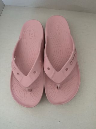 Vendo un par de chanclas Crocs en tonos rosa y blanco. Son muy cómodas y están prácticamente nuevas porque solo se usaron para estar en casa. Talla 34-35 - Diseño de tiras cruzadas. - Suela blanca.