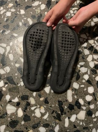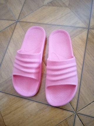 Chanclas cómodas y prácticas. Cierre de velcro ajustable. Suela con textura. Diseño abierto. Están puestas un día.