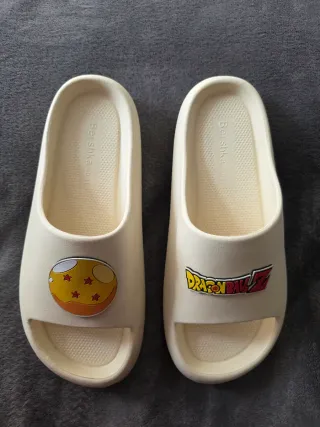 Chanclas de la marca Bershka con diseño de Dragon Ball. - Detalle de las Esferas del Dragón en una chancla. - Logo de Dragon Ball Z en la otra chancla. - Color beige.