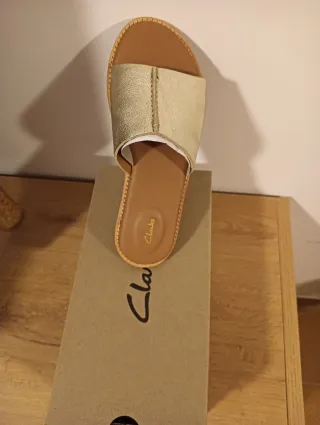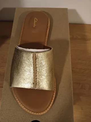 Sandalias planas de la marca Clarks en color dorado. Perfectas para el día a día. - Diseño abierto. - Material exterior con acabado brillante. - Suela cómoda.