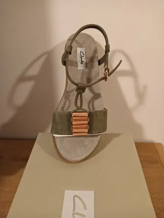 Sandalias Clarks Nuevas de nobuk en color verde oliva. Cuentan con un diseño elegante y tiras ajustables.costaban 89€. - Material exterior: Nobuk. - Color: Topo. - Talla: 36.