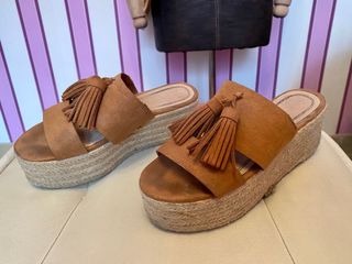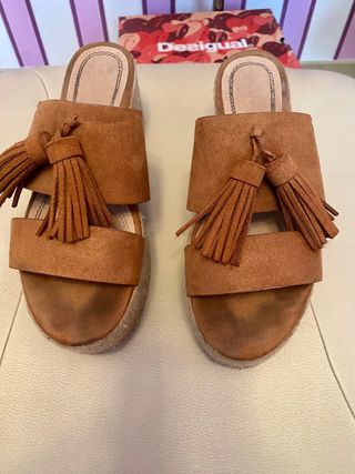 Sandalias de plataforma con detalle de flecos y esparto. - Material: Ante sintético. - Buen estado, envío en caja de cartón. - Plataforma forrada de esparto 7 cm.