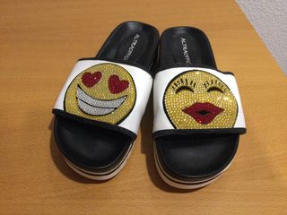 Preciosas chanclas de la marca TRUCCO. Son de color turquesa y negro, y de talla 40. Están en muy buen estado. - Diseño único con detalles de abalorios. - Suela plana cómoda. - Perfectas para el verano.