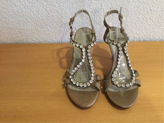 Sandalias tacón bajo en nude con pedreria dorada, super discretas y cómodas, ideales para cualquier evento más o menos formal. Regalo bolsito de mano Sinéquanone en tejido beige con abalorios, cierre de clip. El bolso tiene unos hilos escapados en el asa, de ahí el precio. Si eres manitas, lo dejas como nuevo 😍