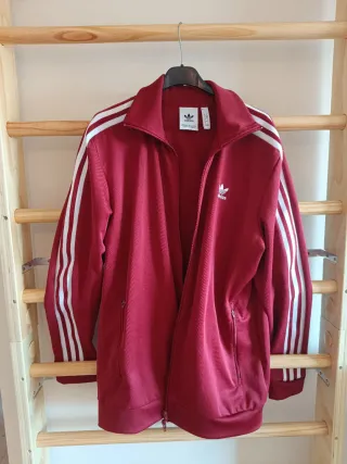 Chaqueta chandal Adidas en color rojo. - Diseño con las icónicas tres rayas blancas en las mangas. - Logo de Adidas en el pecho. - Cremallera frontal. - Bolsillos laterales con cremallera.