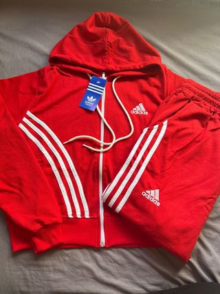 Conjunto deportivo Adidas de dos piezas. - Chaqueta deportiva roja con detalles blancos. - Pantalón deportivo negro con detalles blancos.