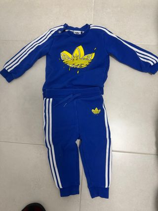 Conjunto de chándal para niño de la marca Adidas, compuesto por sudadera con capucha y pantalón. - Sudadera con cremallera completa. - Pantalón con cintura elástica. - Diseño deportivo. Para niño bebe de 9-12 meses. Da talla para poco mas de 1 año. Muy bontio