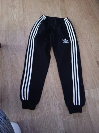 Pantalón de chándal con el clásico diseño de tres rayas. - Diseño con tres rayas laterales. - Logo de la marca en la parte frontal. - Es el modelo que se ajusta mucho a la pierna, tipo leggins. - Se vende porque se nos ha pasado el tiempo para devolver al haber tirado el envoltorio original. - Tiene la etiqueta original