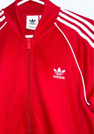 Chándal deportivo Adidas de color rojo. - Diseño clásico con las tres rayas blancas en las mangas. - Logo de Adidas en el pecho. - Cremallera frontal.