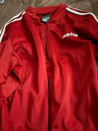 Chándal deportivo de la marca Adidas en color rojo. Presenta el diseño clásico de tres rayas blancas en las mangas. - Cierre de cremallera frontal. - Cuello redondo. - Bolsillos laterales con cremallera. El chándal es 100% original y se encuentra en un estado inmejorable, sin defectos, manchas ni signos de desgaste. Cualquier cosa no dudes en preguntar.