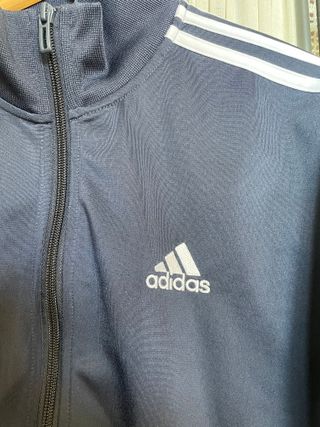 Chándal clásico de la marca Adidas en color azul marino. Diseño deportivo y cómodo. - Cremallera frontal completa. - Cuello alto. - Puños y bajo elásticos. - Tres rayas blancas en las mangas. - Buen estado general. El conjunto presenta pequeños deshilachados/enganchones superficiales, visibles en detalle en las fotos, que no afectan al uso ni a la estructura de la prenda.
