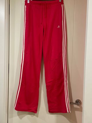 Pantalón de chándal Adidas en color rojo. Presenta el diseño clásico de tres rayas blancas a los lados. - Cintura elástica. - Puños ajustados en los tobillos. - Logo de Adidas bordado. 🔬 Talla del artículo: M 🎨 Color: Rojo 🔍 Estado: 9/10 muy buen estado en general 🚚 El envío se realiza dentro de las 48h posteriores a la compra.