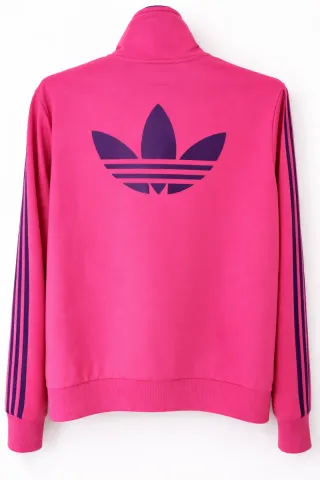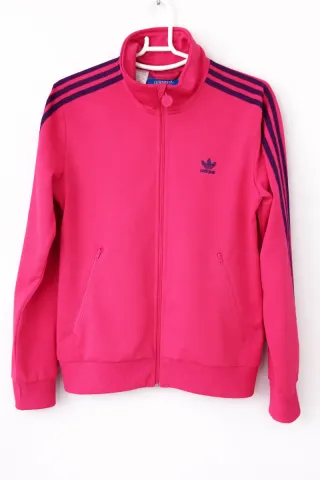 Chaqueta deportiva Adidas en color rosa vibrante. Presenta el icónico diseño de tres rayas en contraste en las mangas. - Cierre completo con cremallera. - Cuello alto. - Bolsillos laterales con cremallera.