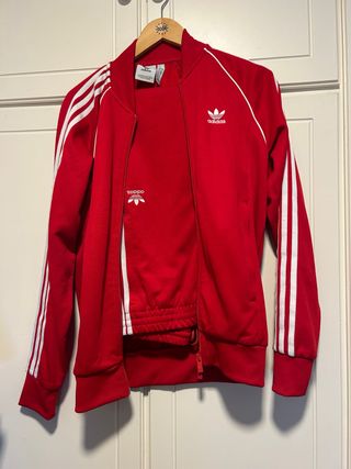 Conjunto deportivo Adidas de dos piezas en color rojo. - Chaqueta con cremallera completa y cuello alto. - Pantalón con cintura elástica y cordón. - Tres rayas blancas características en las mangas y perneras. - Logos de Adidas bordados en la chaqueta y el pantalón. Conjunto 65€,cada parte 40€
