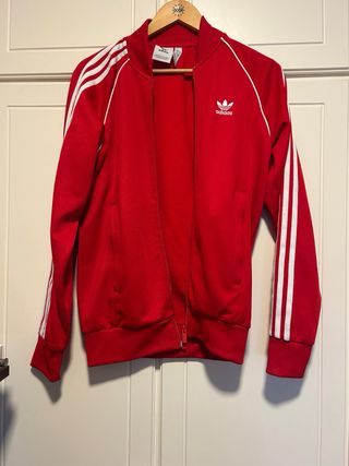 Chaqueta deportiva Adidas en color rojo. - Diseño clásico con las tres franjas blancas en las mangas. - Logo de Adidas bordado en el pecho. - Cierre de cremallera frontal.