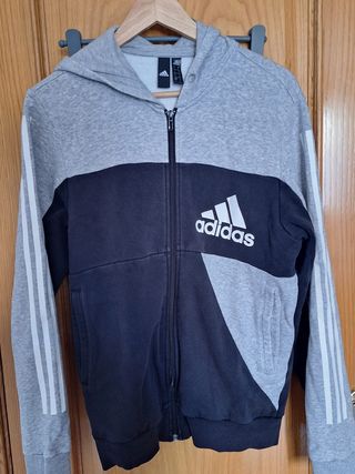 Conjunto deportivo completo de Adidas. 35€ por unidad o 65€ en conjunto. - Sudadera con capucha y cordones. - Pantalón con cintura elástica. - Diseño con las tres rayas icónicas de la marca en las mangas y piernas.