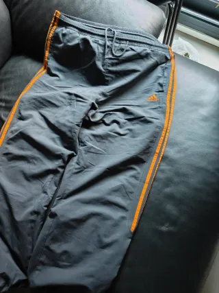 Pantalón de chándal estilo baggy de Adidas, con un toque Y2K. - Diseño holgado. - Detalles de rayas naranjas en los laterales. - Cintura con cordón ajustable.